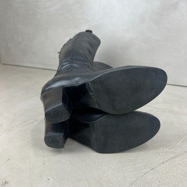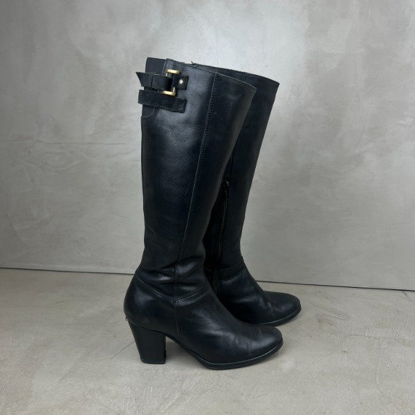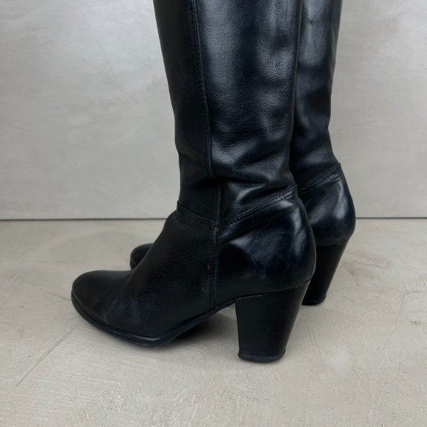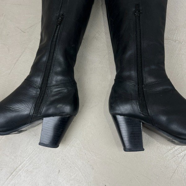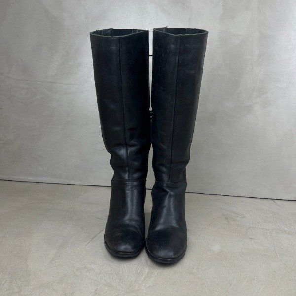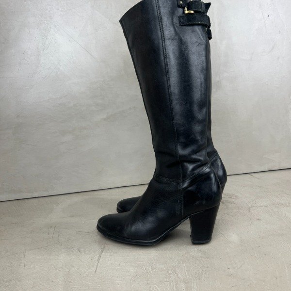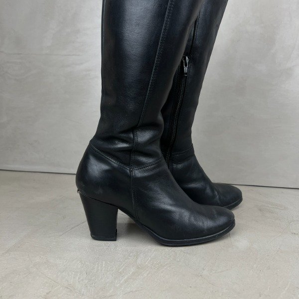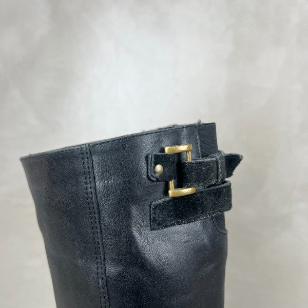 De cuero. Caña larga de 37cm (medida desde la base donde termina el taco), el taco mide 7cm. El forro interno de cuero ecológico se está saltando, esto no afecta su estética ni función. Nuestro calzado está sanitizado en su interior para mayor seguridad.