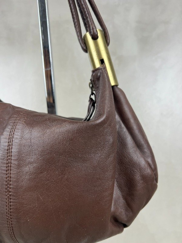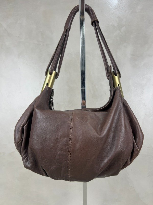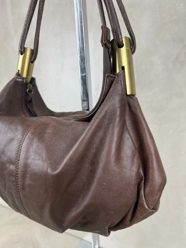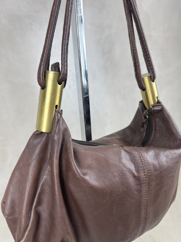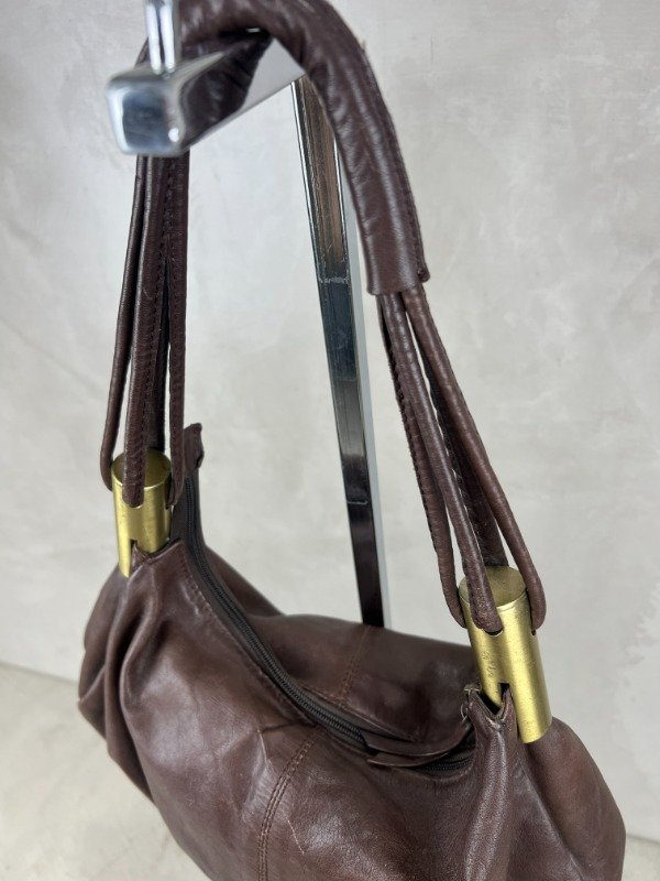 Bolso de cuero con apliques metálicos en color dorado. Tamaño mediano.