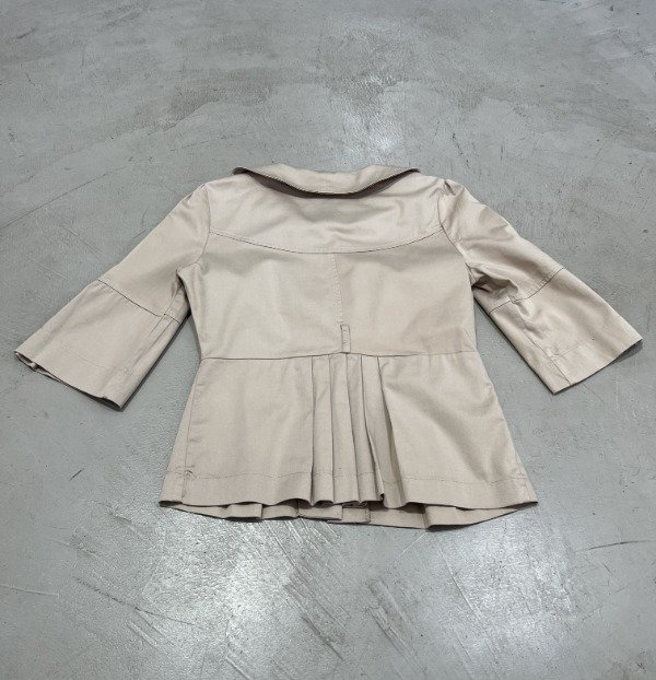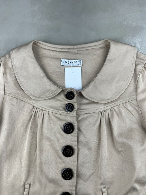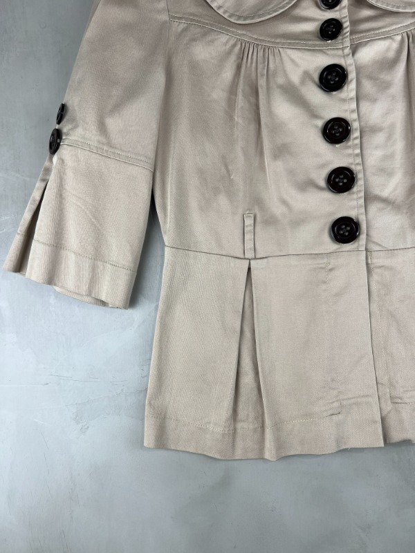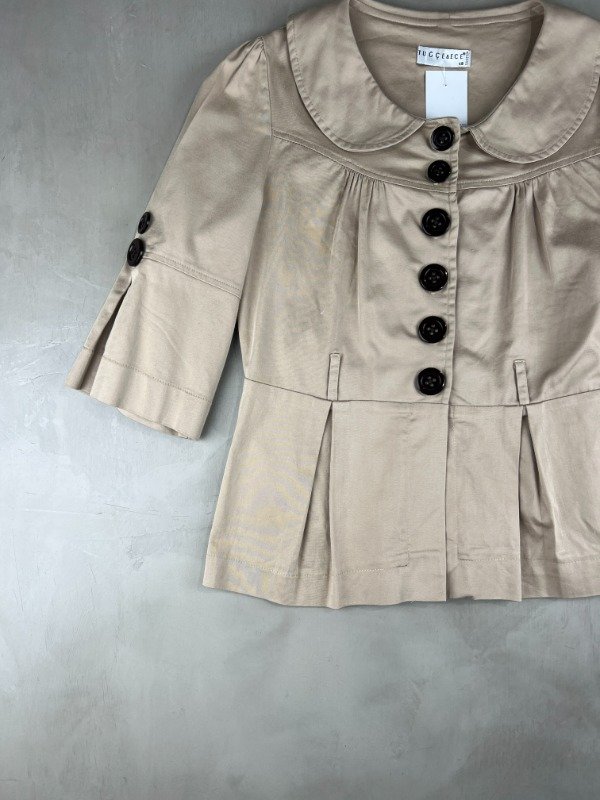 Saquito beige con muchos botones marrones y mangas 3/4, 97% algodón 3% elastano.