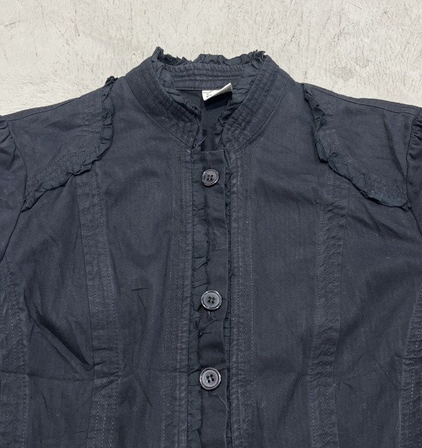Campera de gabardina negra entallada con mini volados en su moldería en hombros, cuello y botonera.
