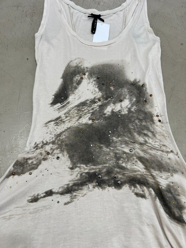 Vestido de algodón beige con estampa y apliques metálicos, la mordería de la falda del vestido esta conformada por picos irregulares y mucha tela dándole el volumen justo.