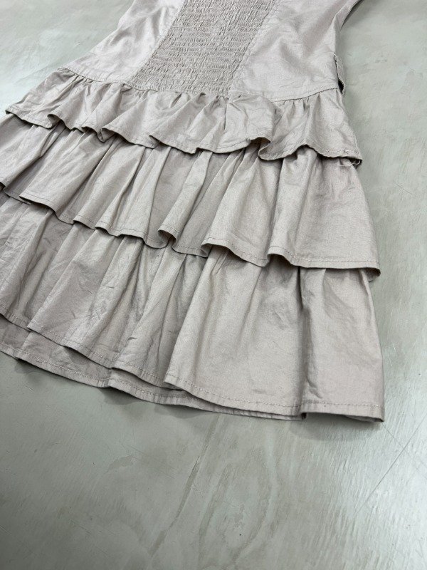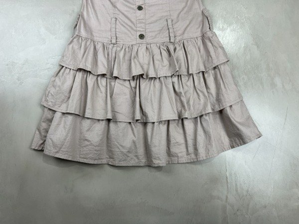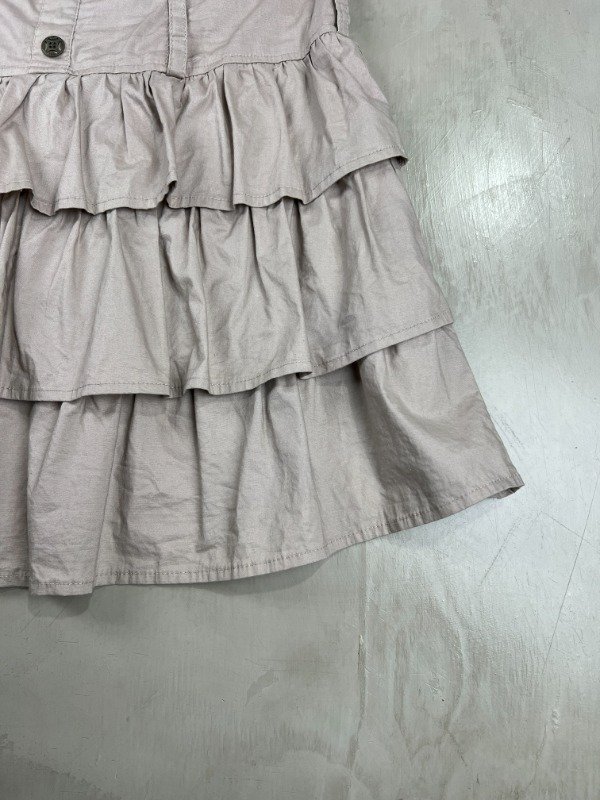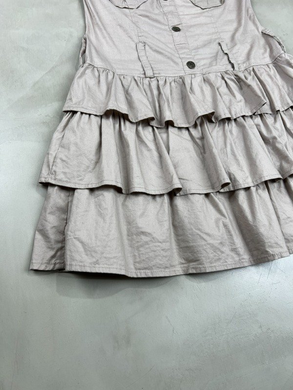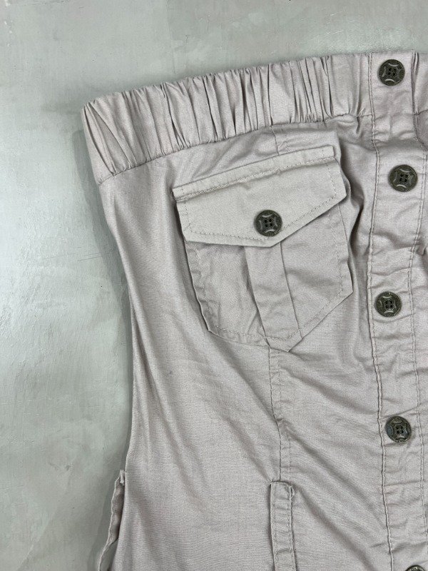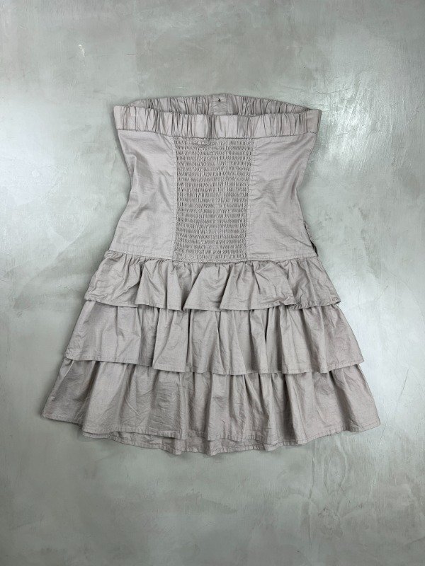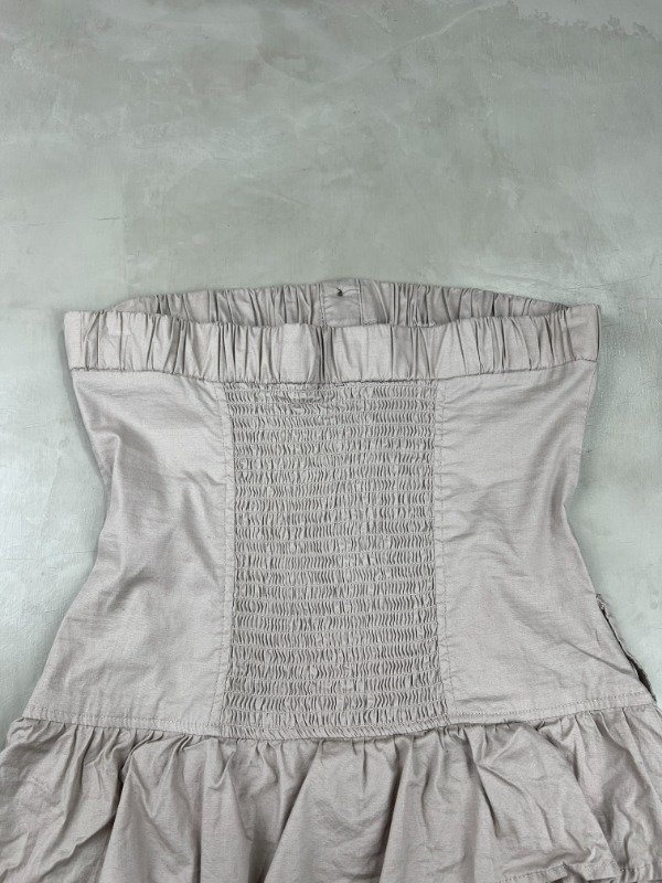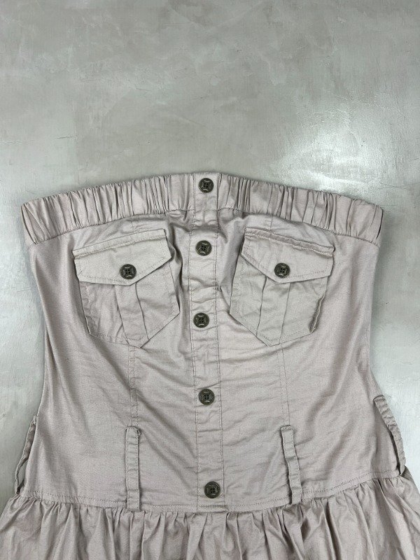 Vestido strapless 98% algodón, 2% spandex, diseño superior tipo cargo con botones y la falda con mucho volado generando volumen.